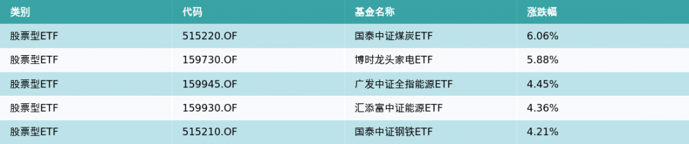 上周股票型ETF涨幅最高的5支ETF及其收益率分别为:国泰中证煤炭ETF(6.06%)、博时龙头家电ETF(5.88%)、广发中证全指能源ETF(4.45%)、汇添富中证能源ETF(4.36%)、国泰中证钢铁ETF(4.21%)。详情见下表: