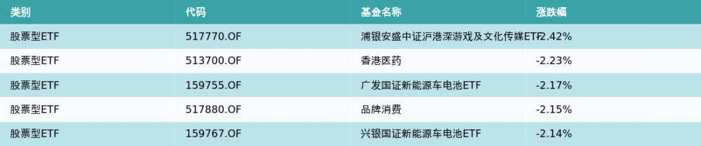 上周股票型ETF跌幅最大的5支ETF及其收益率分别为:浦银安盛中证沪港深游戏及文化传媒ETF(-2.42%)、香港医药(-2.23%)、广发国证新能源车电池ETF(-2.17%)、品牌消费(-2.15%)、兴银国证新能源车电池ETF(-2.14%)。详情见下表: