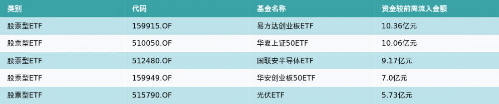 上周股票型ETF资金流入最多的5支ETF及其流入金额分别为:易方达创业板ETF(流入10.36亿元)、华夏上证50ETF(流入10.06亿元)、国联安半导体ETF(流入9.17亿元)、华安创业板50ETF(流入7.0亿元)、光伏ETF(流入5.73亿元)。详情见下表:
