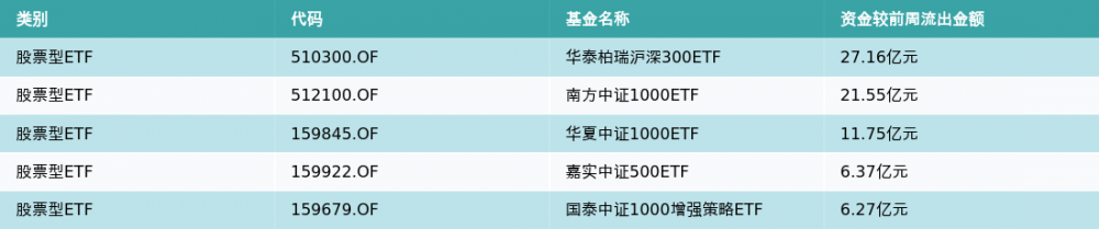 上周股票型ETF资金流出最多的5支ETF及其流入金额分别为:华泰柏瑞沪深300ETF(流出27.16亿元)、南方中证1000ETF(流出21.55亿元)、华夏中证1000ETF(流出11.75亿元)、嘉实中证500ETF(流出6.37亿元)、国泰中证1000增强策略ETF(流出6.27亿元)。详情见下表: