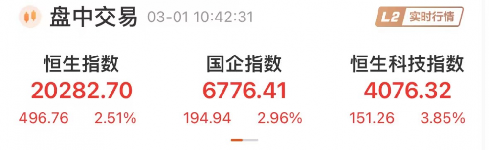 今日(3月1日),港股集体上涨,直线拉升,截至发稿,恒生科技指数涨近4%,恒生指数涨超2%。