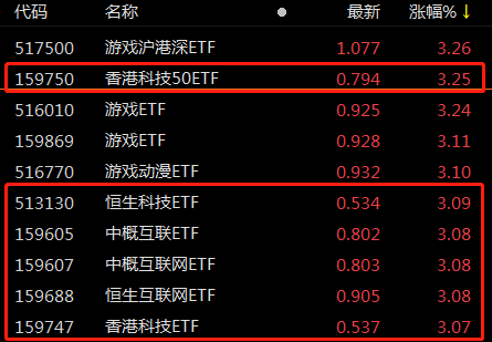 ETF方面,截至发稿,香港科技50ETF(159750)、恒生科技ETF(513130)、中概互联ETF(159605)、中概互联网ETF(159607)、恒生互联网ETF(159688)、香港科技ETF(159747)涨超3%。