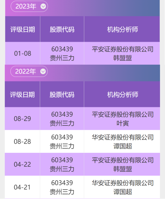 剩余的4次分析师评级由平安证券给出。平安证券的叶寅分析师、韩盟盟分析师当前在分析师评价行情类排行榜分别高居第11名、第25名,同时在分析师评价(医药生物行业)行情类排行榜分别夺得第6名、第12名。今年1月8日韩萌萌分析师作为第一作者为贵州三力发布点评:开喉剑喷雾剂保持快速增长,外延并购带来新增长点,维持“推荐”评级。我们认为核心品种开喉剑喷雾剂是国家专利及独家品种,疫情进一步加速需求释放,同时具备纳入新版基药可能。外延并购持续推进带来新的增长点。我们暂维持公司2022年-2024年归母净利润分别为1.93亿元、2.44亿元、3.13亿元的预测,维持“推荐”评级。