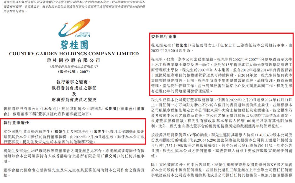 2022年底,杨国强的侄子杨志成、老臣宋军辞任执行董事,常务副总裁程光煜、首席财务官伍碧君新任执行董事。