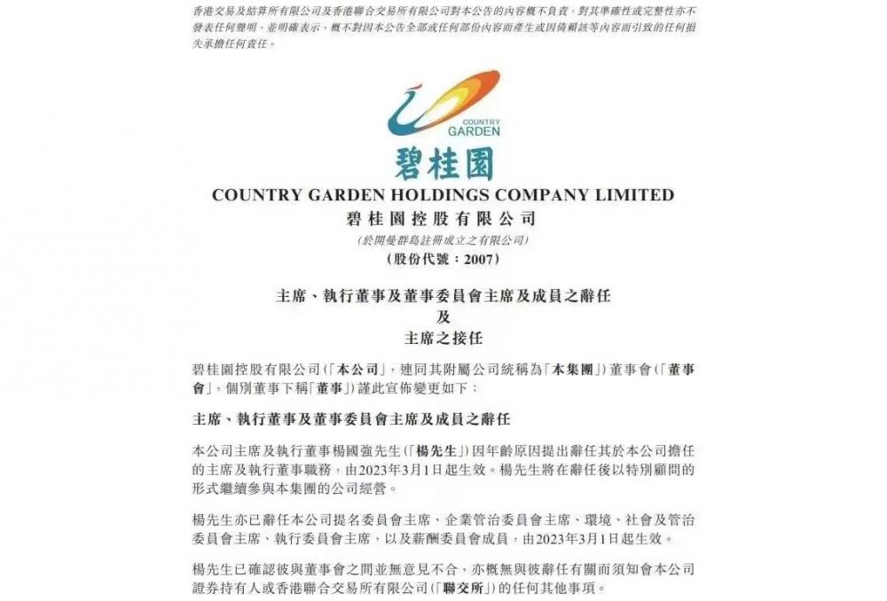 3月1日,碧桂园发布公告,集团创始人杨国强辞任公司主席及执行董事,即日起生效。