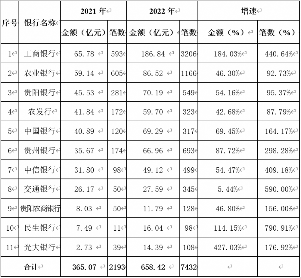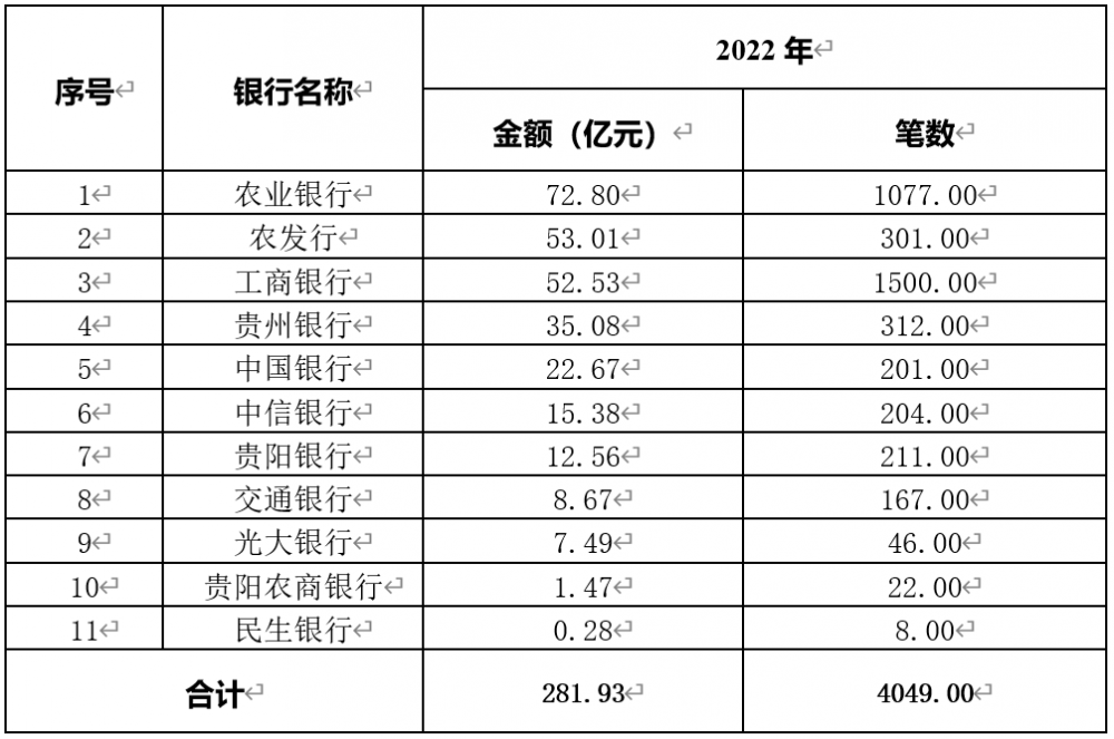 从投放金额看,工行、农行、贵阳银行、中国银行、贵州银行位列前5位,共计投放金额479.79亿元;从投放笔数看,工行、农行、贵州银行位列前3位,分别为3206笔、1166笔、693笔,同比增速分别为440%、92%、298%;11家合作银行平均增速达300%,投放笔数与增速均实现了大幅增长。