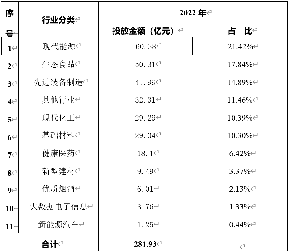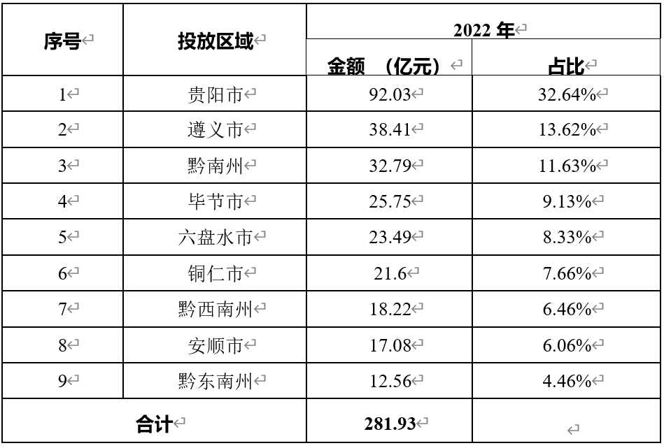 从投放区域看,贵阳市、遵义市、黔南州位列前三位,投放金额分别为92.03亿元、38.41亿元、32.79亿元,占比分别为32.64%、13.62%、11.63%。十大工业产业累计投放金额249.62亿元,占比88.54%。其中,现代能源、生态食品、先进装备制造产业投放金额位列前3位,分别为60.38亿元、50.31亿元、41.99亿元,占比分别为21.42%、17.84%、14.89%。