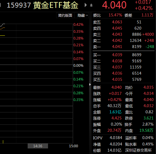 今日,COMEX黄金涨0.27%,报1845.3美元/盎司。黄金ETF基金(159937)涨0.42%,盘中交易溢价,成交额逾1.6亿元。