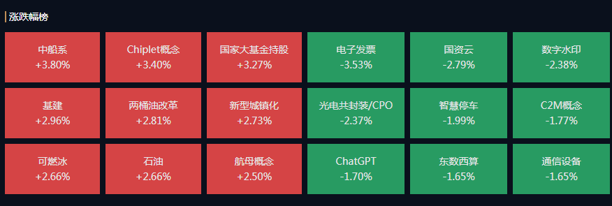 南财主题库显示,板块方面,中船系概念股、Chilet概念、国家大基金持股概念股、基建等领涨;电子发票概念股、国资云概念股、数字水印概念股领跌。