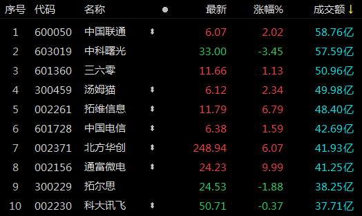 中国联通成交额居首,为58.8亿元。其次是中科曙光、三六零、汤姆猫、拓维信息,成交额分别为57.6亿元、51亿元、50亿元、48.4亿元。