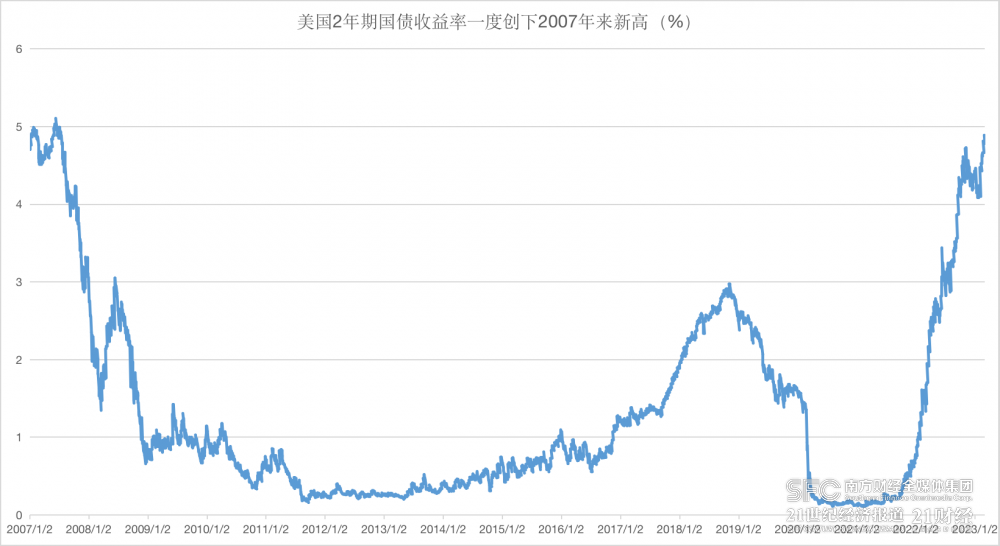投资者对粘性通胀和更高峰值利率的担忧挥之不去之际,有着“全球资产定价之锚”之称的10年期美债收益率3月初一度突破4%关口,重新回到了去年四季度触及的十余年高位附近。2年期美债收益率更是一度突破4.94%,创下了2007年以来的最高水平,以两年期为代表的短债收益率通常与央行利率变动联系最为紧密,反映了一系列强劲的经济数据正支持着紧缩预期。