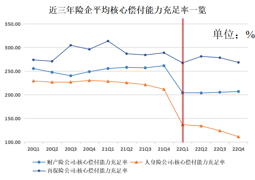 记者整理近三年的保险公司平均偿付能力充足率发现,自2022年1季度偿二代二期全面实施后,保险公司偿付能力充足率一路走低,截至2022年4季度,行业平均综合、核心偿付能力充足率均下跌至近年来的低位,分别为196%和128.4%,其中人身险公司整体表现尤为明显。