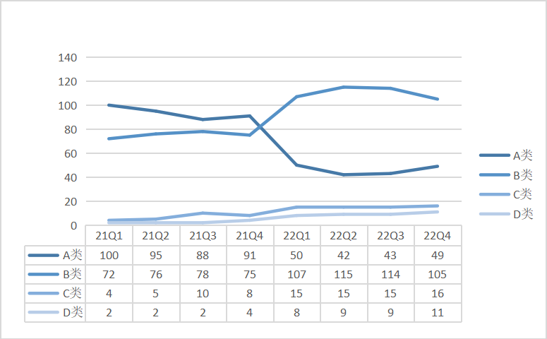 除偿付能力充足率指标外,2022年保险公司风险综合评级同样值得关注。从风险评级看,进入到2022年,被评为A类的险企数量从21年4季度的91家径直下降至50家,近乎出现折半减少,多数险企成为B类。而C类、D类险企的数量也明显增多,截至2022年4季度,C类公司从2021年4季度的8家增至16家;D类公司从4家增加至11家。