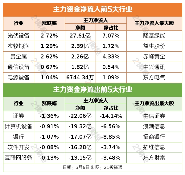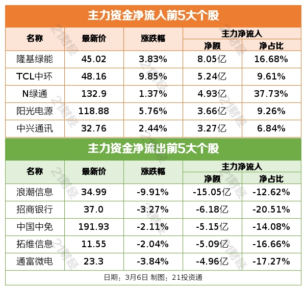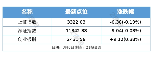 昨日(3月6日)A股收盘,三大指数涨跌不一,上证指数收跌0.19%,深证成指收跌0.08%,创业板指探底回升收涨0.38%。沪深两市当日成交额约9509亿元,较上一交易日放量超814亿元,北向资金净买入0.76亿元。