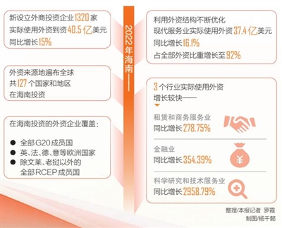 2022年,海南新设立外商投资企业1320家,实现实际使用外资到资40.5亿美元,同比增长15%。