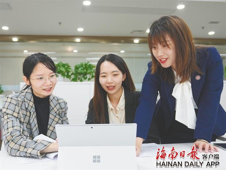 (在位于海口的全球贸易之窗,入驻企业员工办公交流。)