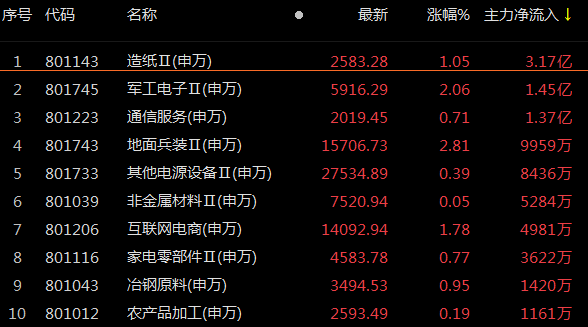 今日早盘指数震荡下跌,资金层面,造纸Ⅱ(申万)板块获主力资金抢筹,截至发稿,主力资金净流入造纸板块超3亿元,军工电子Ⅱ(申万)、通信服务(申万)等获主力资金净流入超1亿元。
