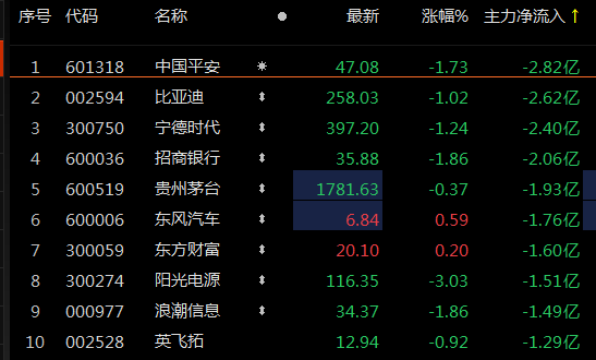 同时,中国平安、比亚迪、宁德时代、招商银行主力资金净流出中国超2亿元。