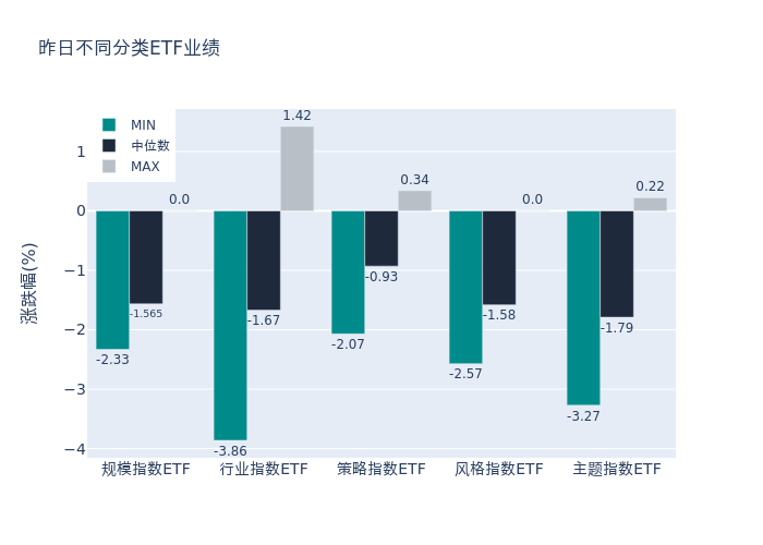 昨日股票型ETF收益率中位数为-1.7%。其中按照不同分类,规模指数中博时标普500ETF收益率最高,为0.0%;行业指数中汇添富中证能源ETF收益率最高,为1.42%;策略指数中南方富时中国国企开放共赢ETF收益率最高,为0.34%;风格指数中招商中证银行AH价格优选ETF收益率最高,为0.0%;主题指数中博时上证自然资源ETF收益率最高,为0.22%。