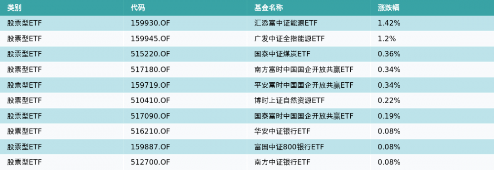 昨日股票型ETF涨幅最高的3支ETF及其收益率分别为:汇添富中证能源ETF(1.42%)、广发中证全指能源ETF(1.2%)、国泰中证煤炭ETF(0.36%)。涨幅前10详情见下表: