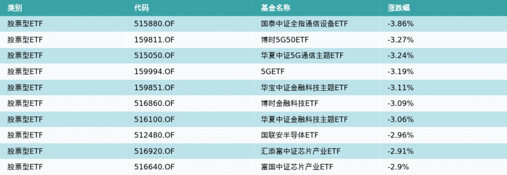昨日股票型ETF跌幅最大的3支ETF及其收益率分别为:国泰中证全指通信设备ETF(-3.86%)、博时5G50ETF(-3.27%)、华夏中证5G通信主题ETF(-3.24%)。跌幅前10详情见下表: