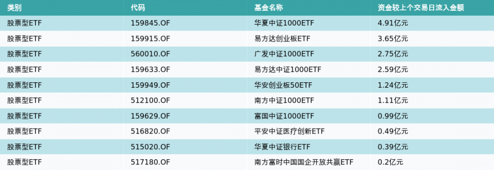 昨日股票型ETF资金流入最多的3支ETF及其流入金额分别为:华夏中证1000ETF(流入4.91亿元)、易方达创业板ETF(流入3.65亿元)、广发中证1000ETF(流入2.75亿元)。资金流入前10详情见下表: