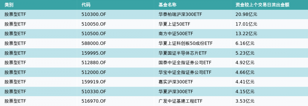 昨日股票型ETF资金流出最多的3支ETF及其流入金额分别为:华泰柏瑞沪深300ETF(流出20.98亿元)、华夏上证50ETF(流出17.01亿元)、南方中证500ETF(流出13.22亿元)。资金流出前10详情见下表: