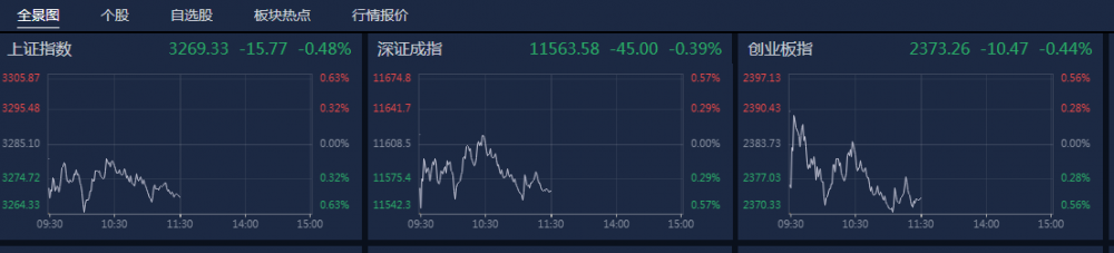 南财金融终端显示,上证指数跌0.48%,深证成指跌0.39%,创业板跌0.44%。