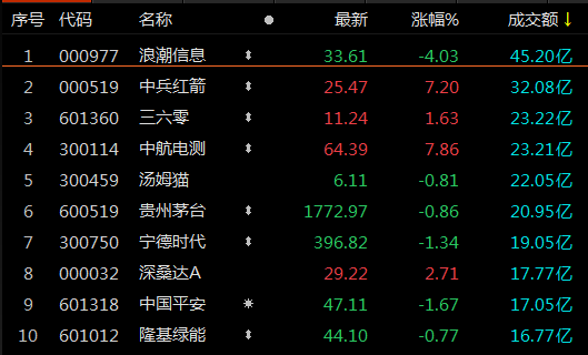 沪深两市今日成交额4447亿,较上个交易日缩量1030亿。截至午盘,浪潮信息成交额达45亿元,中兵红箭成交额达32亿元。