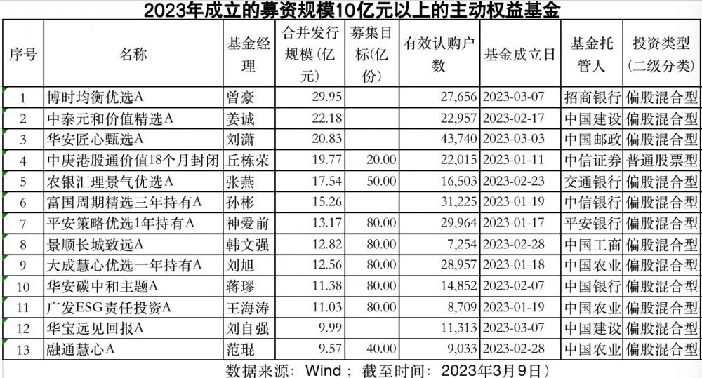 此外,今年募资额超10亿元的主动权益基金还有大成基金刘旭、平安基金神爱前等知名基金经理管理的产品。