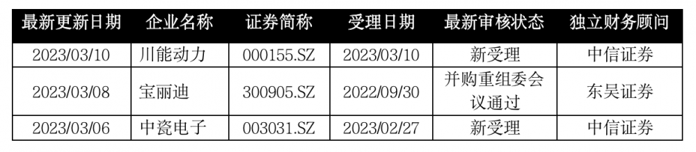 3家企业更新重组审核动态,2家新受理,1家并购重组委会议通过。