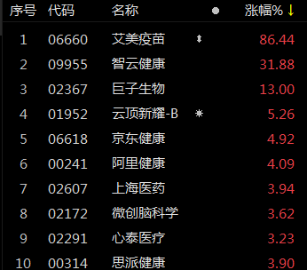 截至发稿,恒生医疗ETF(513060)成份股中艾美疫苗涨超86%,智云健康涨超31%,巨子生物涨13%。