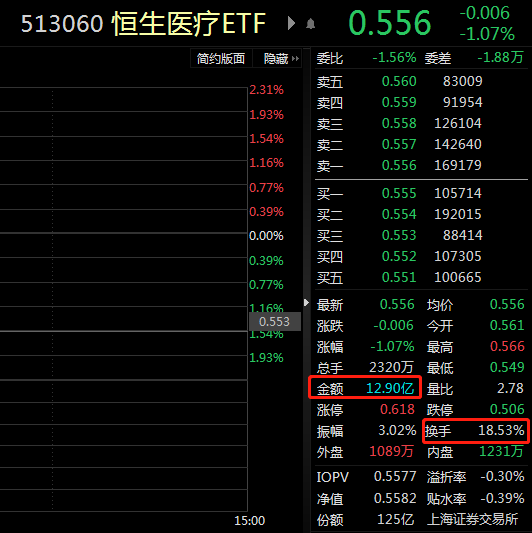 截至发稿,恒生医疗ETF(513060)跌1.07%,成交额超12亿元,换手率为18.53%,交投活跃。同时,该ETF近20日资金净流入超14亿元,份额增长24.05亿份。