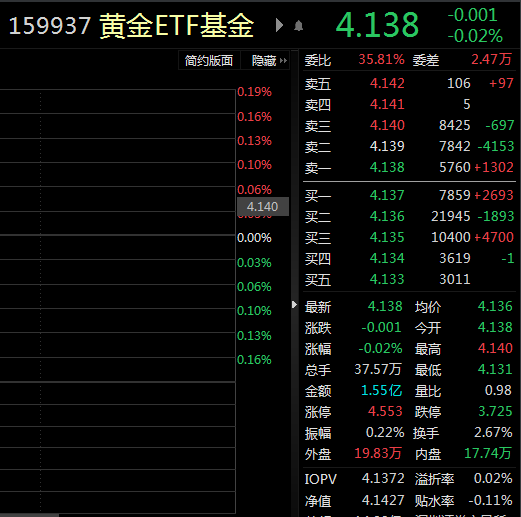 今日(3月15日),黄金ETF基金(159937)窄幅盘中震荡,溢折率波动,盘中多空博弈。