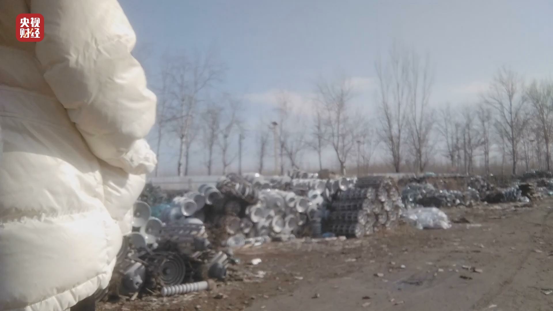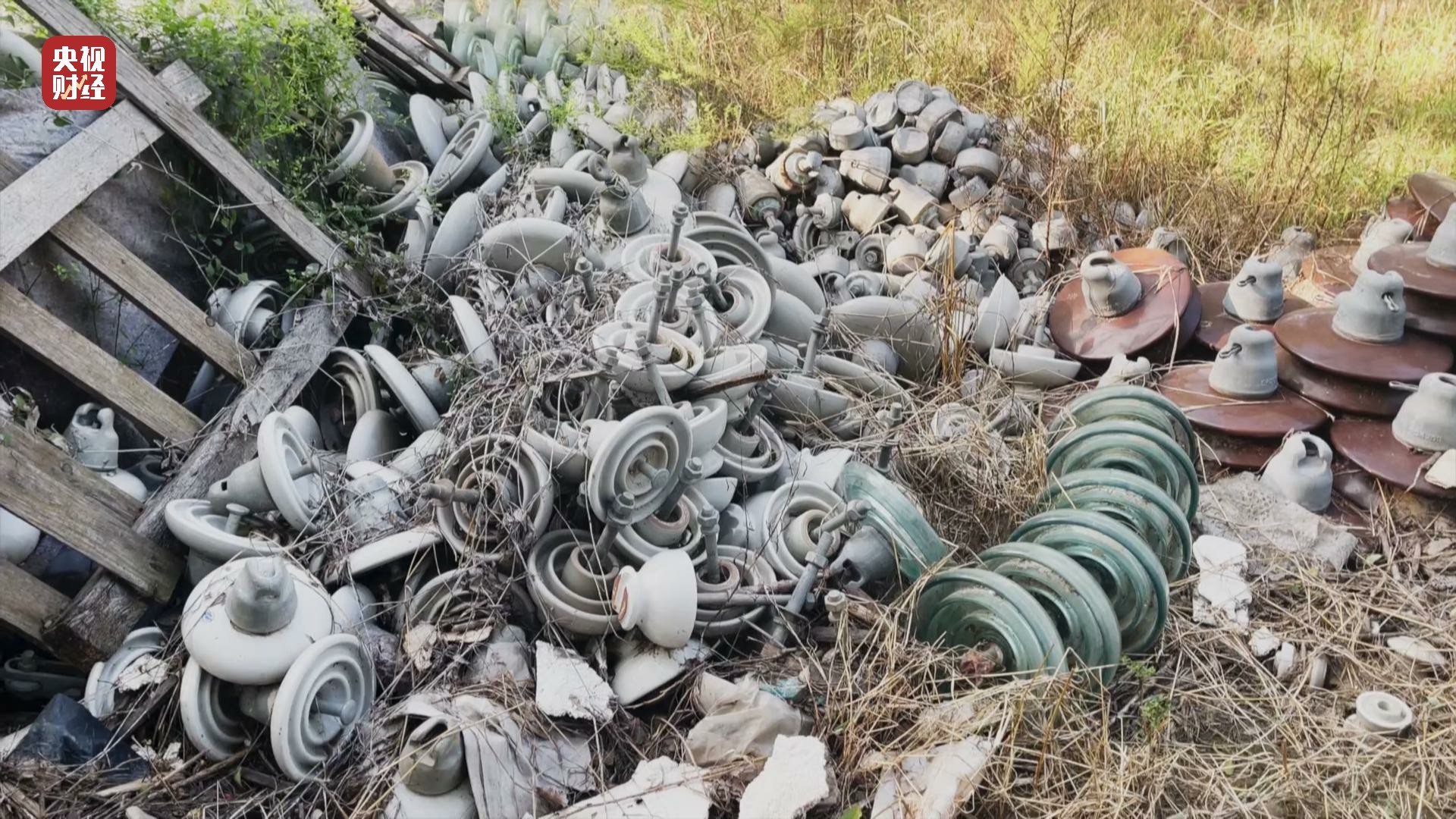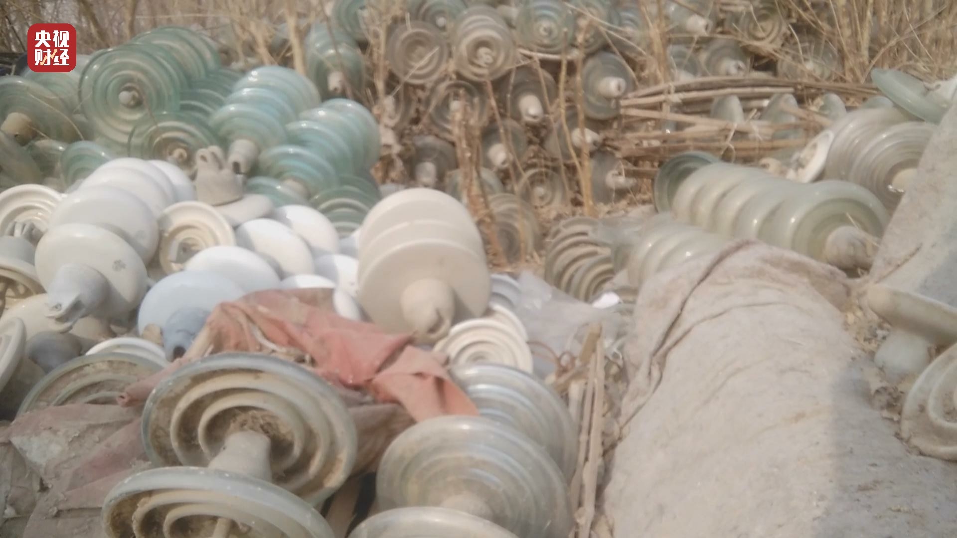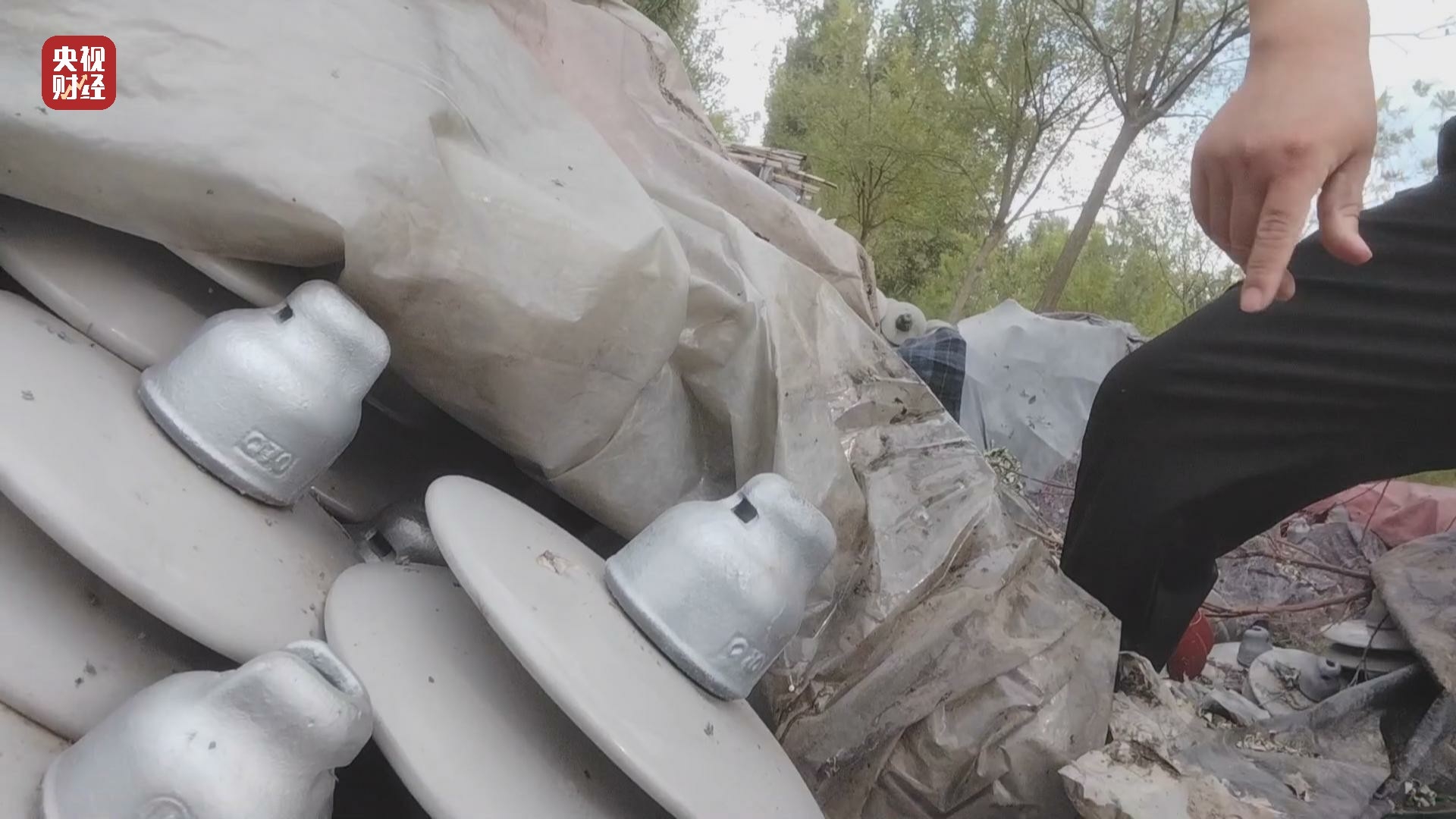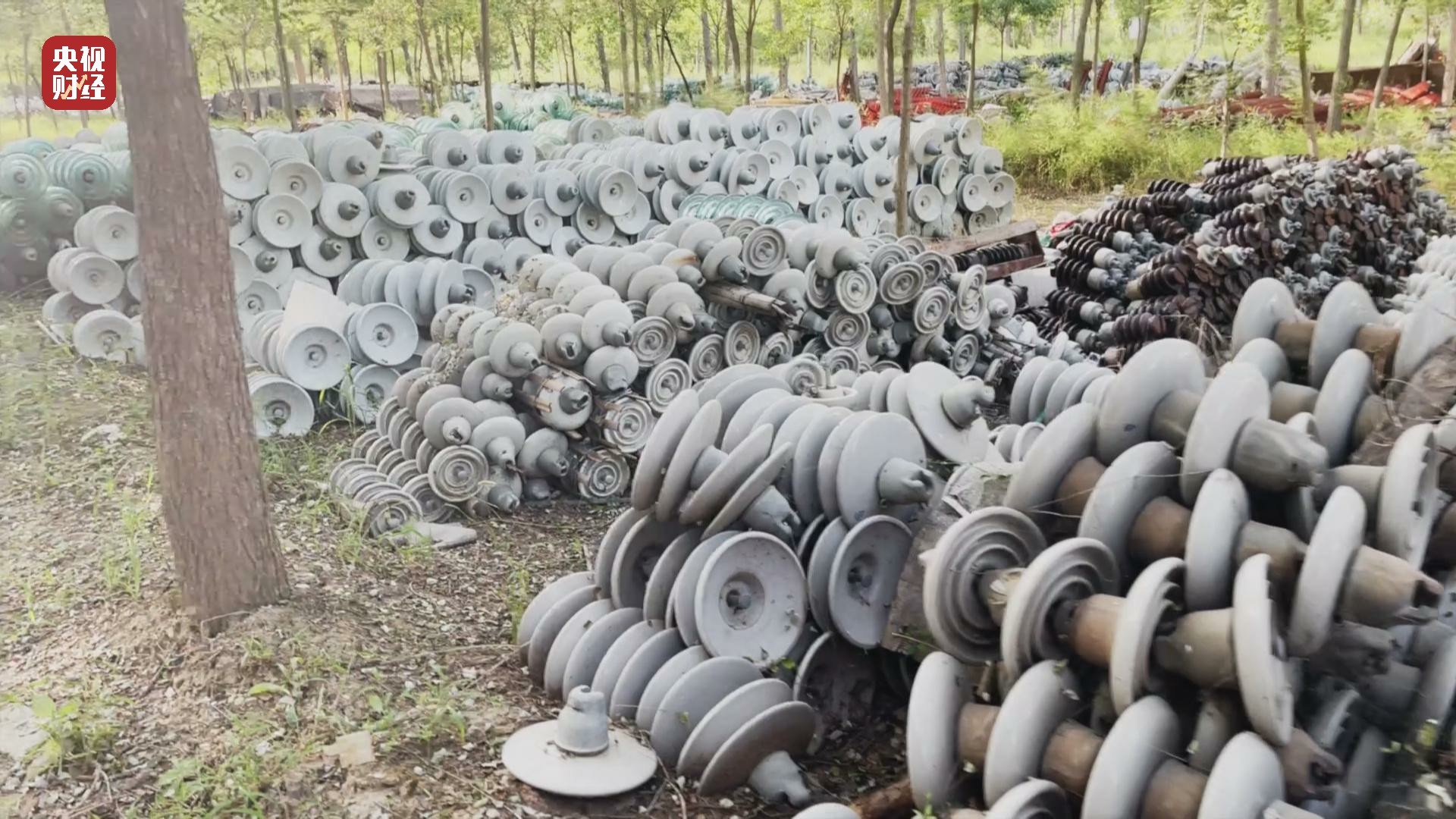在河北省河间市西旧馆村,树林里道路两旁堆放一堆堆绝缘子,有玻璃的也有陶瓷的,金属表面有明显被腐蚀的痕迹,有的甚至锈迹斑斑。村民告诉记者,这些都是各地电网用过的旧绝缘子。