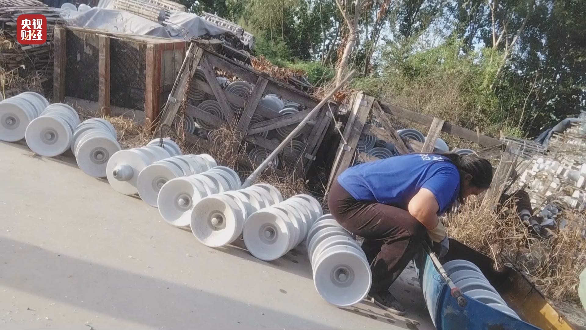 西旧馆村周边为什么会堆放着这么多旧绝缘子呢?树林里,几名村民正在拆卸旧的绝缘子。在另一处,村民正在忙着清洗拆卸后的绝缘子。