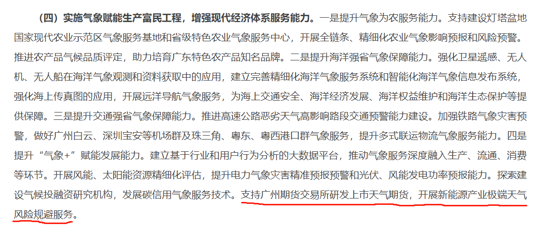 而此次,广东省人民政府于3月14日印发的《广东省加快推进气象高质量发展实施意见》也提出,支持广州期货交易所研发上市天气期货,开展新能源产业极端天气风险规避服务。