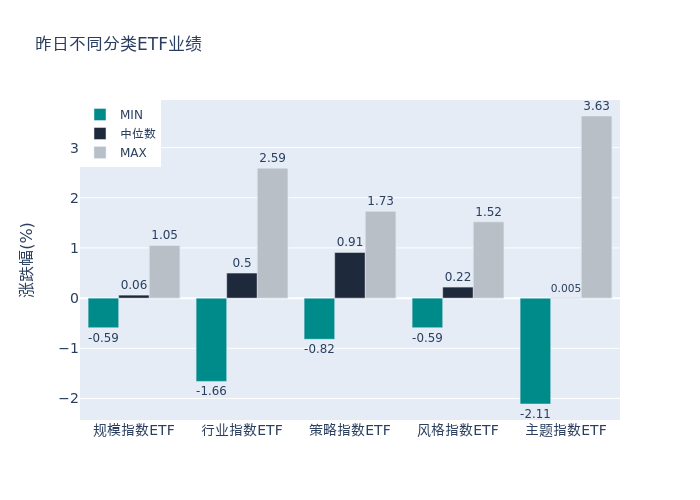 昨日股票型ETF收益率中位数为0.06%。其中按照不同分类,规模指数中300价值A收益率最高,为1.05%;行业指数中香港医药收益率最高,为2.59%;策略指数中红利LV收益率最高,为1.73%;风格指数中小盘价值收益率最高,为1.52%;主题指数中广发中证基建工程ETF收益率最高,为3.63%。