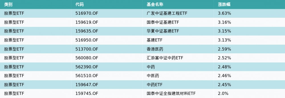 昨日股票型ETF涨幅最高的3支ETF及其收益率分别为:广发中证基建工程ETF(3.63%)、国泰中证基建ETF(3.16%)、华夏中证基建ETF(3.15%)。涨幅前10详情见下表: