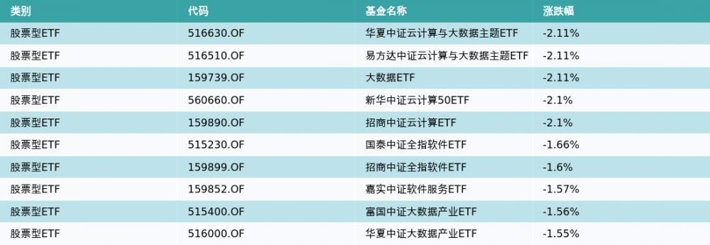 昨日股票型ETF跌幅最大的3支ETF及其收益率分别为:华夏中证云计算与大数据主题ETF(-2.11%)、易方达中证云计算与大数据主题ETF(-2.11%)、大数据ETF(-2.11%)。跌幅前10详情见下表:
