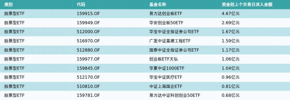 昨日股票型ETF资金流入最多的3支ETF及其流入金额分别为:易方达创业板ETF(流入4.67亿元)、华安创业板50ETF(流入2.69亿元)、华宝中证全指证券公司ETF(流入1.67亿元)。资金流入前10详情见下表: