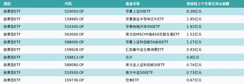 昨日股票型ETF资金流出最多的3支ETF及其流入金额分别为:华夏上证50ETF(流出8.39亿元)、华夏国证半导体芯片ETF(流出1.95亿元)、华泰柏瑞沪深300ETF(流出1.92亿元)。资金流出前10详情见下表: