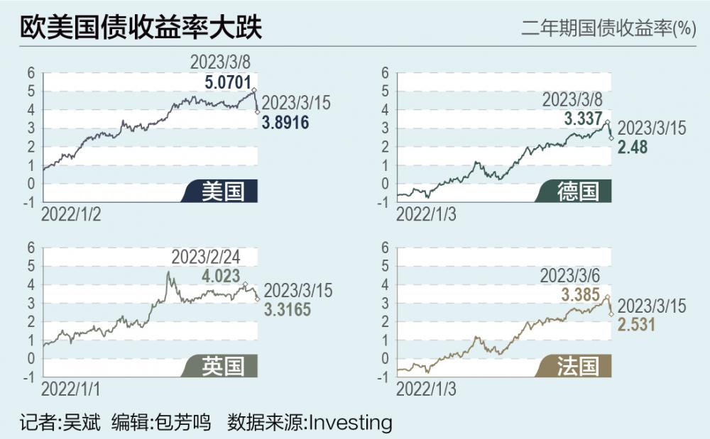 但硅谷银行迅速崩溃以及瑞信风波再起,迫使交易员扭转了对更高利率的押注,人们开始预期美联储和欧洲央行将转向鸽派,避免加剧银行业的压力。随着投资者重新涌入国债,收益率急剧下降,创下数十年来最大跌幅。