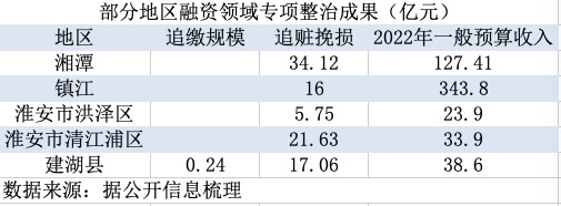 另据记者梳理,江苏省镇江市、淮安市清江浦区、淮安市洪泽区、建湖县也公布相关数据,上述五地融资领域专项整治追赃挽损近100亿,有地方追赃挽损的规模已相当于当地去年一般公共预算收入的六成多。但需注意的,因为涉及不同地方,相关口径可能有出入。此外,追赃挽损的规模要远大于对融资中介的追缴规模,比如建湖县的一份报告称,巡视结束后已追缴三方费用2410万元,共追赃挽损17.06亿元。