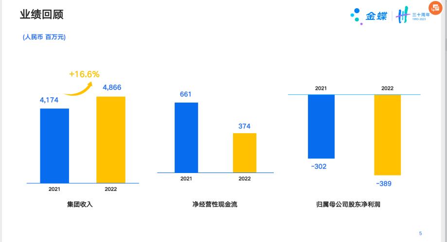 3月15日晚间,金蝶发布2022年年度业绩报告,期内,公司实现收入约48.7亿元,较同期增长16.6%。