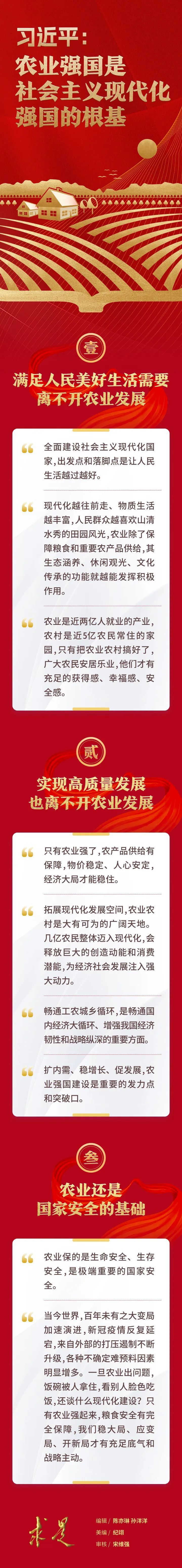 3月16日出版的2023年第6期《求是》杂志刊发习近平总书记重要文章《加快建设农业强国推进农业农村现代化》。文章强调,“没有农业强国就没有整个现代化强国;没有农业农村现代化,社会主义现代化就是不全面的”,“必须深刻领会党中央这一战略部署,把加快建设农业强国摆上建设社会主义现代化强国的重要位置”。