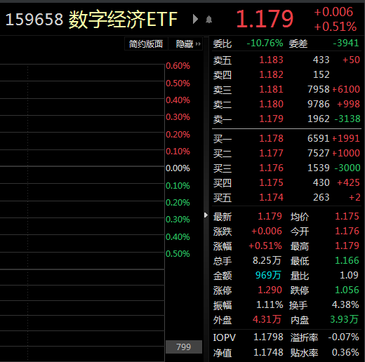 截至发稿,数字经济ETF(159658)震荡走强涨0.51%,换手率为4.38%,成交额近千万,交投活跃。