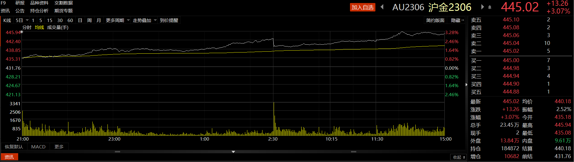 同日,上海期货交易所日间盘黄金期货合约震荡上行,成交活跃,持仓增加。国内黄金期货主力2306合约开盘报435.18元,截至日间收盘,收报445.02元,大涨3.07%,成交量为23.45万手;持仓为184872手,日盘持仓增加10682手。
