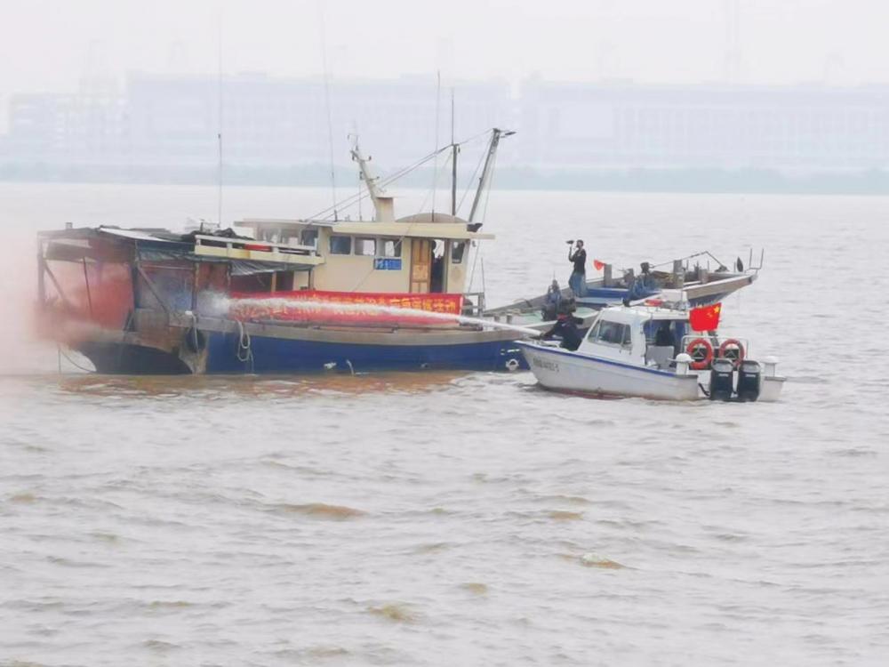 集中销毁现场通过视频连线传输到主会场。随后进行的应急演练采用现场实战方式开展,模拟演练龙穴南水道商、渔船对驶相遇避碰,船员不慎落水及渔船起火实施救援的场景。实战应急演练检验了海洋综合执法部门应对消防安全应急处置能力,提升了渔业船员安全生产意识和应急自救能力。
