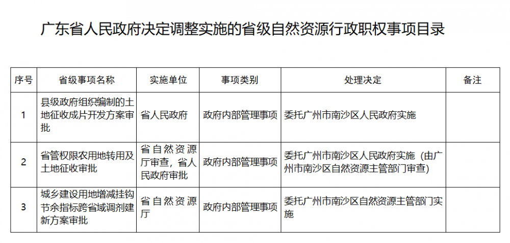 近日,广东省人民政府办公厅发布《关于将部分省级自然资源行政职权事项调整由广州市南沙区实施的决定》(以下简称《决定》)。《决定》指出,为深入贯彻落实《国务院关于印发广州南沙深化面向世界的粤港澳全面合作总体方案的通知》精神,进一步发挥自然资源对广州南沙建设发展的支撑保障作用,省政府决定将部分省级自然资源行政职权调整由广州市南沙区实施。